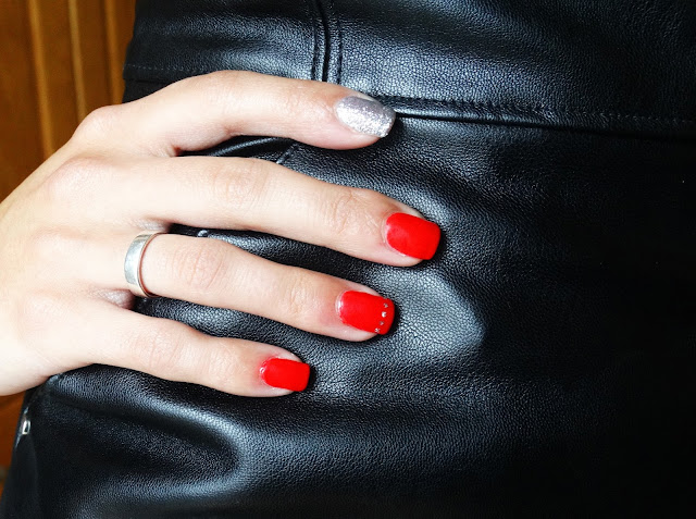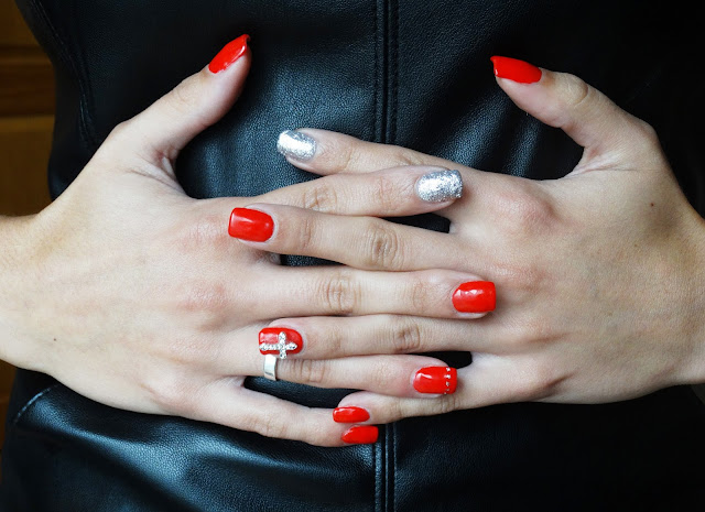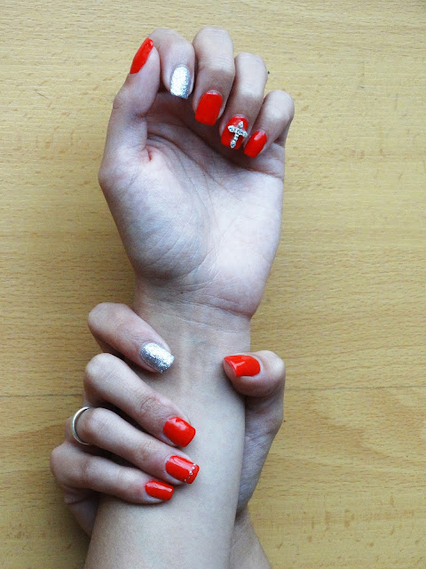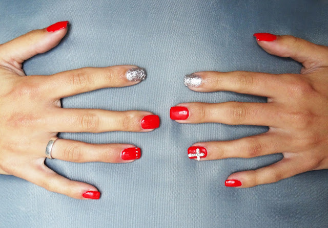 E cá estão as unhas deste mês, quer dizer, não é bem deste mês, em norma faço de três em três semanas porque elas crescem muito. Então e desta vez como ainda não me tinham chegado as cores novas que comprei online, voltei a experimentar o vermelho mas de maneira diferente. Os indicadores eu adoro ver com os brilhantes e isso é muito difícil mudar, mas desta vez apliquei uma cruz 3D que achei muito original e gostei muito do resultado final!