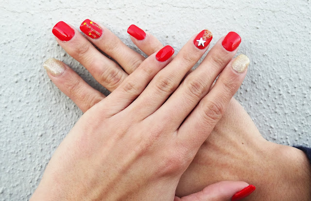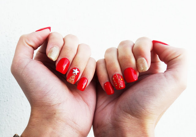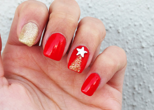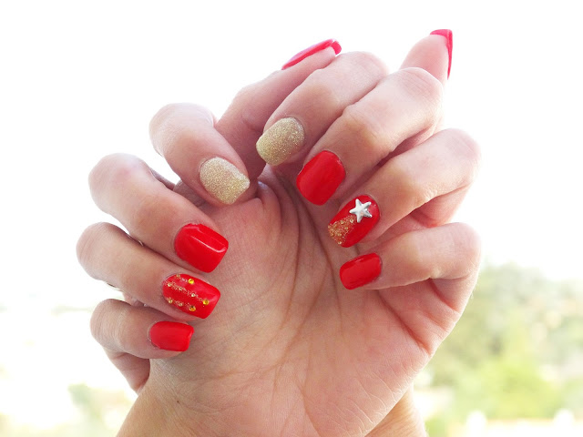 E as minhas unhas de Natal já estão prontinhas! :) Fiquei completamente encantada com o pinheiro, acho que ficou mesmo como eu queria e super perfeitinho, a outra é que não ficou tanto como eu queria... São fitinhas, mas não se percebe tão bem. Mesmo assim adorei, e estes novos brilhantes dourados são qualquer coisa, adoro!